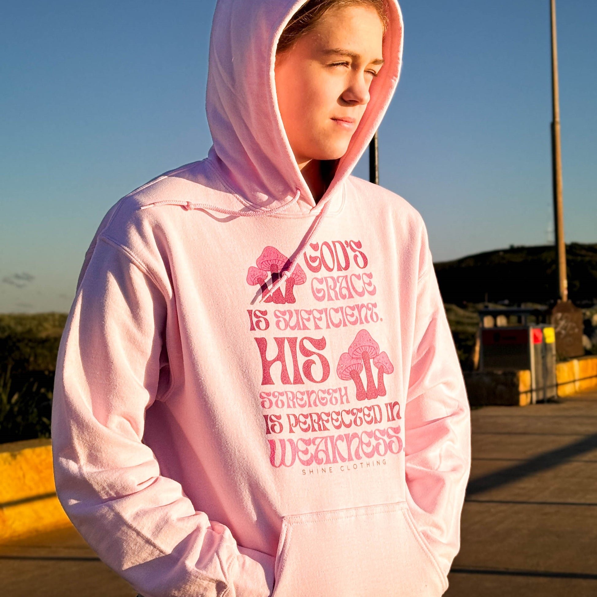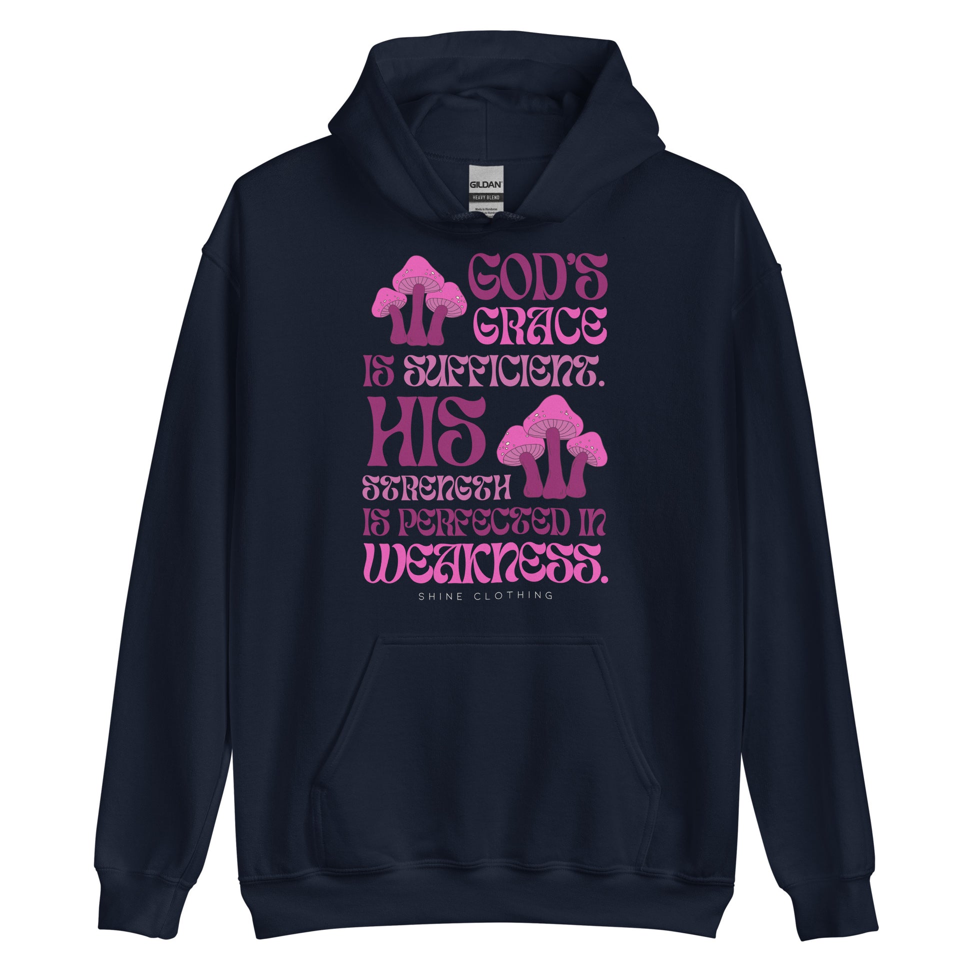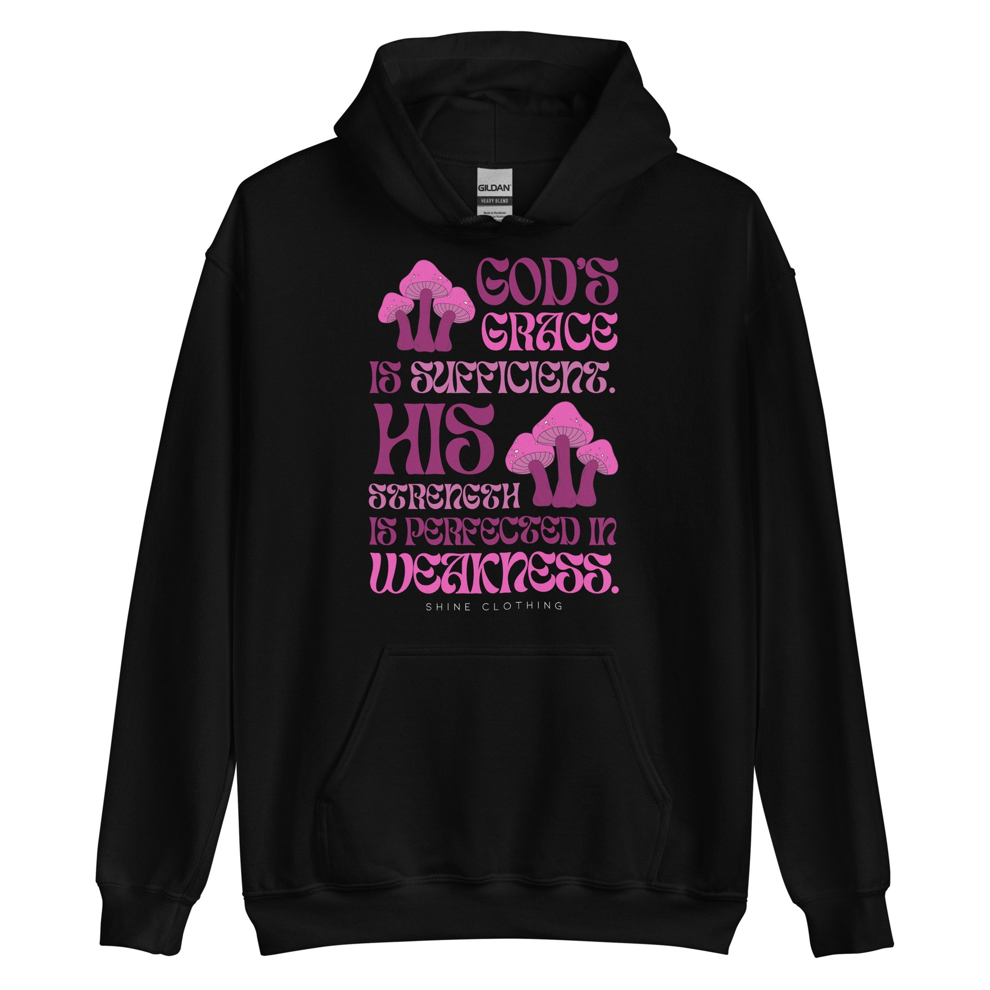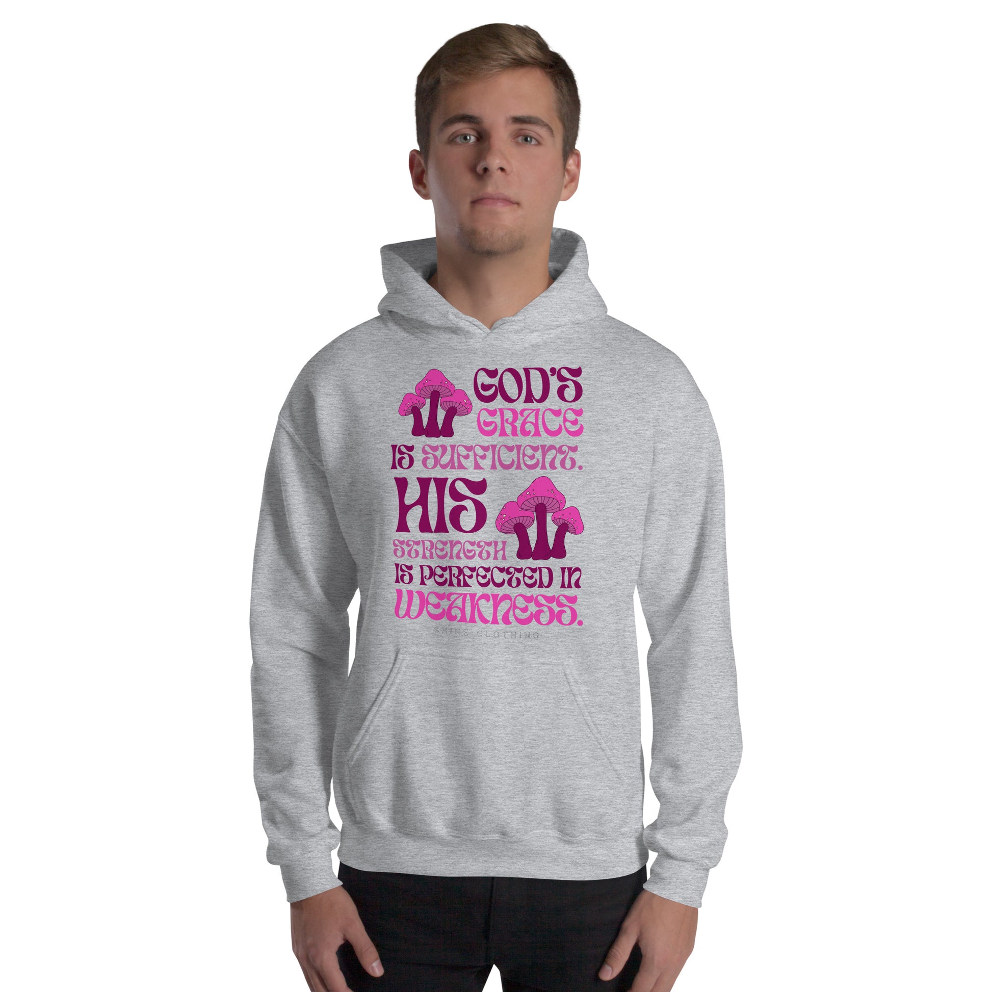 ššŖShare your faith boldly and stylishly with our "Perfected in Weakness" Hoodieā a meaningful reminder of 2 Corinthians 12:9 brought to life through vibrant, vintage-inspired typography and whimsical mushroom illustrations.